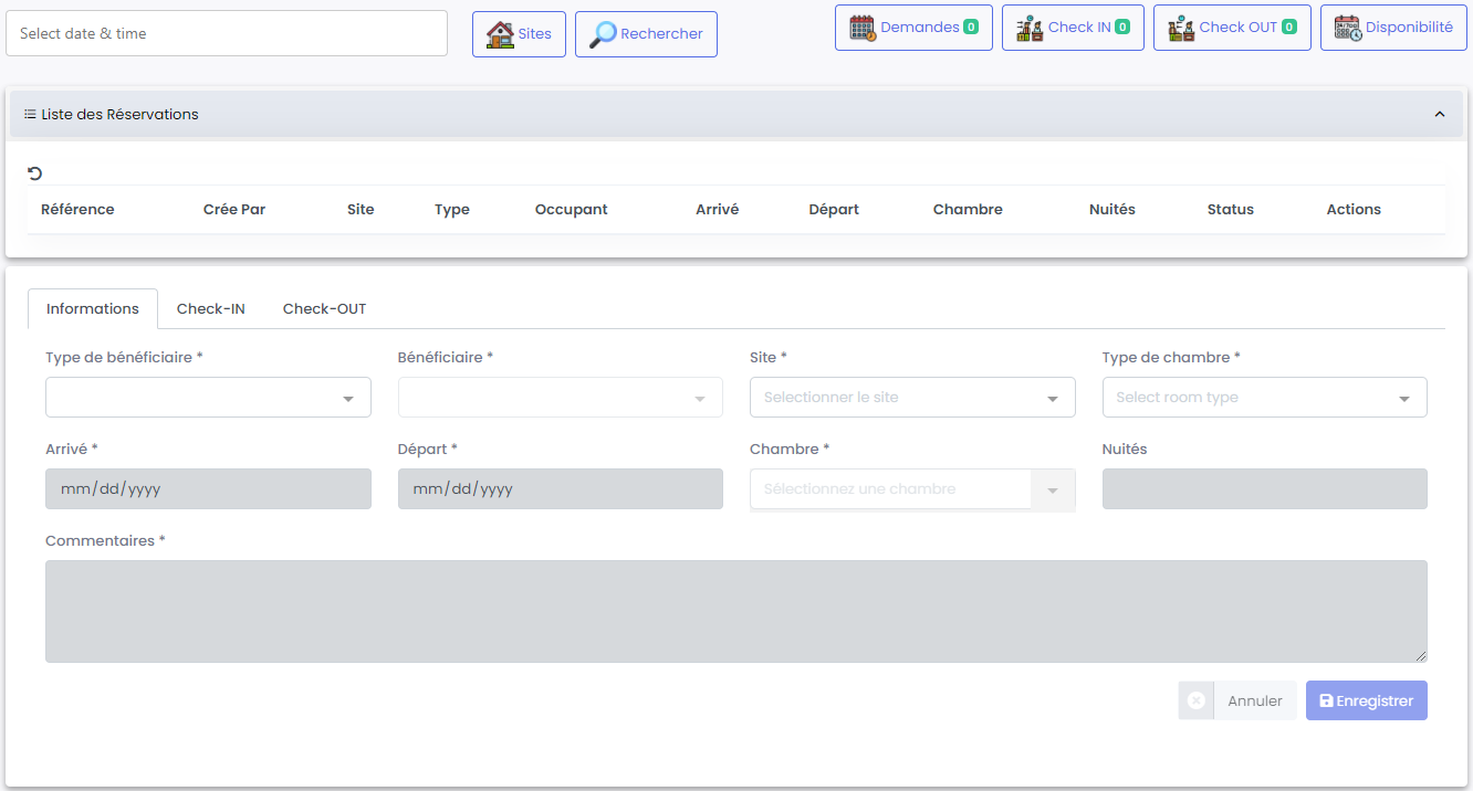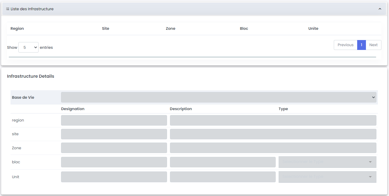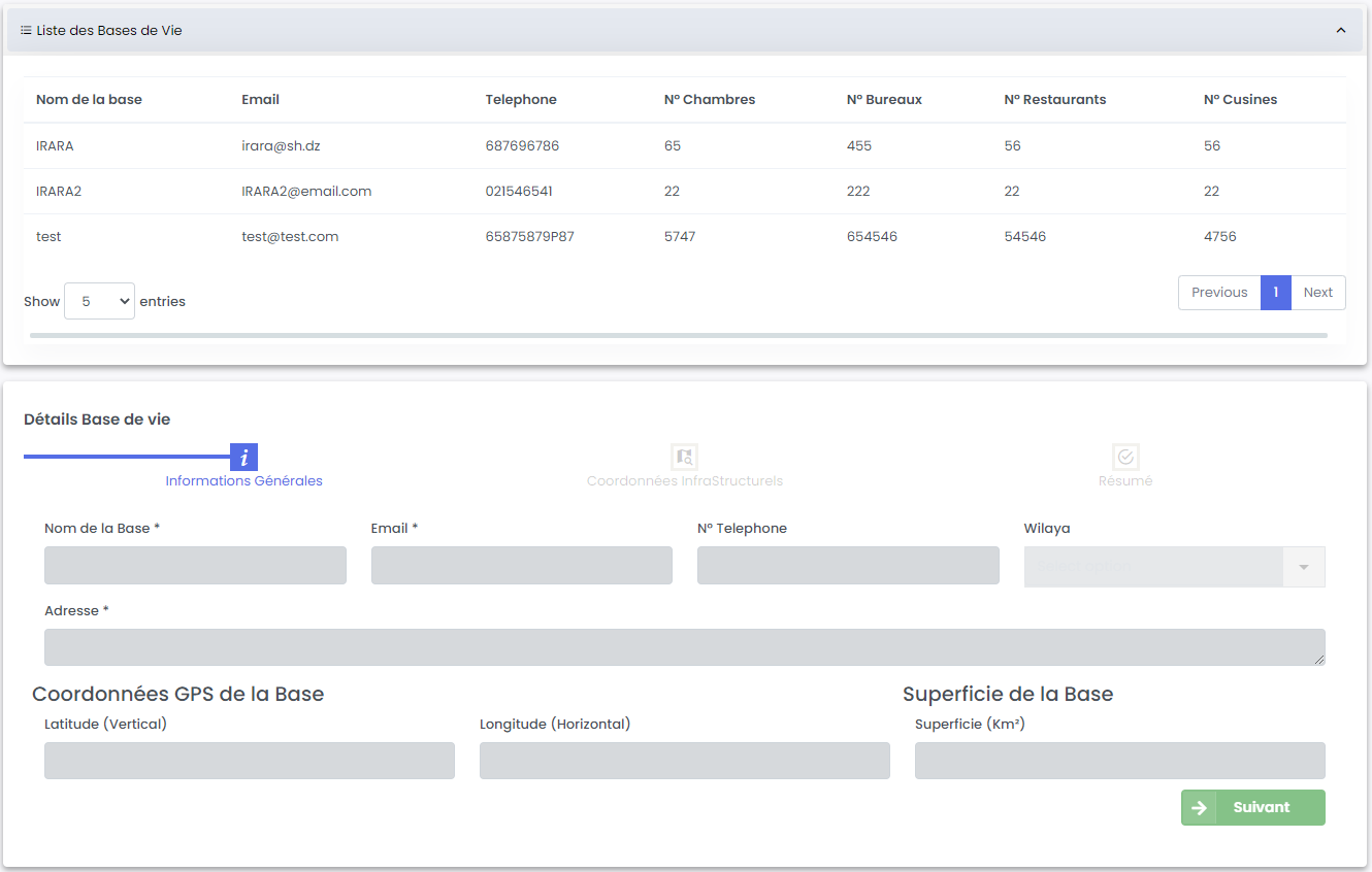 - La liste des sites se trouve en haut du tableau (Pour gérer les sites, allez vers: Master Data > Fiche bases de vies )