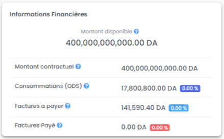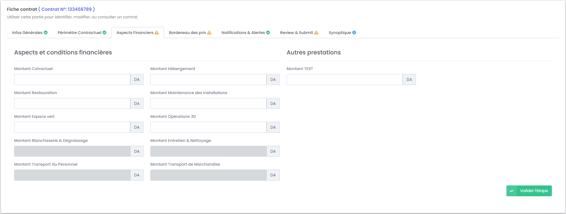 Dans cette section, on va introduire les informations financières du contrat: Le montant contractuel + les montants des prestations sélectionnés dans la page: Périmètre Contractuel