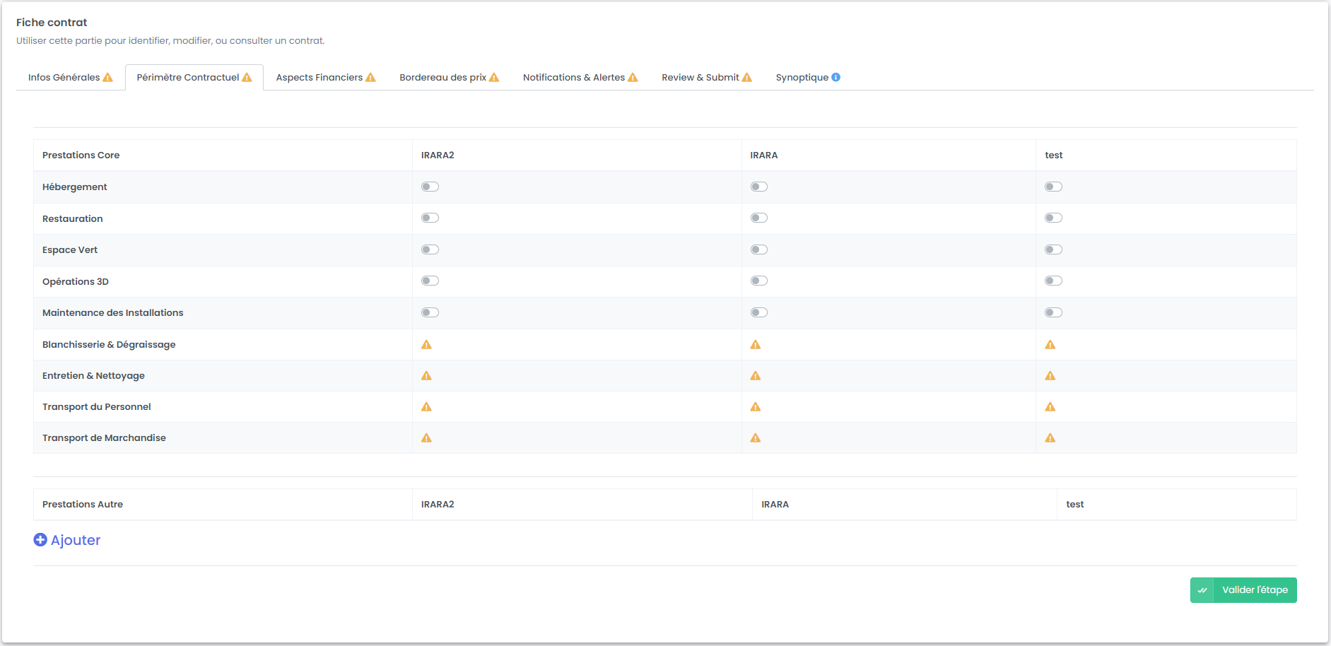 CAMPLUS est un système multi-sites, pour cela, un seul contrat peut gérer un ou plusieurs sites, les tarrifs des prestations peuvent être différentes d'un site a un autre, pour cela, cette étape sert à introduire les prix unitaires, les méthodes de contrôles, et d'autre informations contractuelles utiles pour assurer un suivi fiable du contrat.