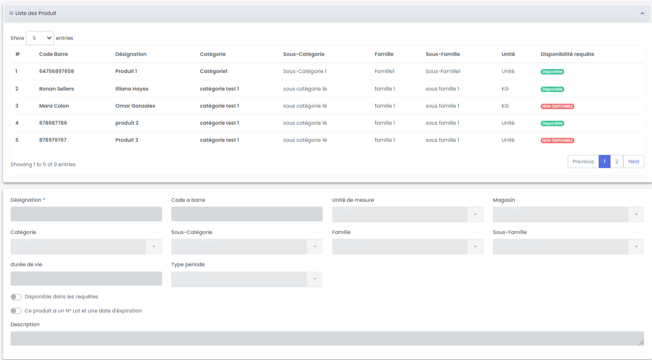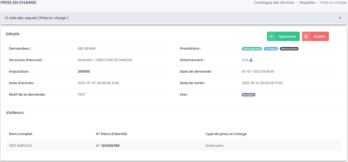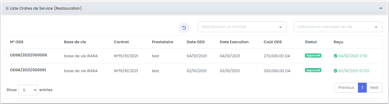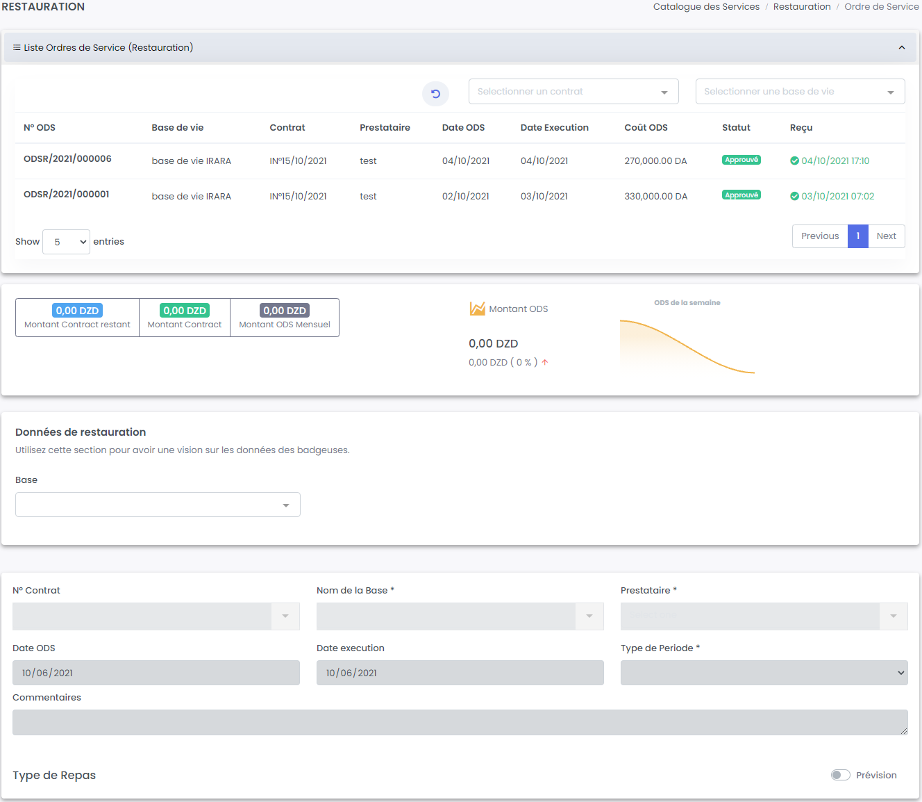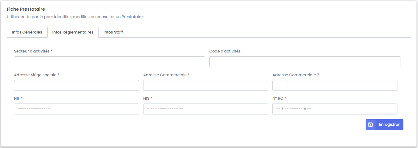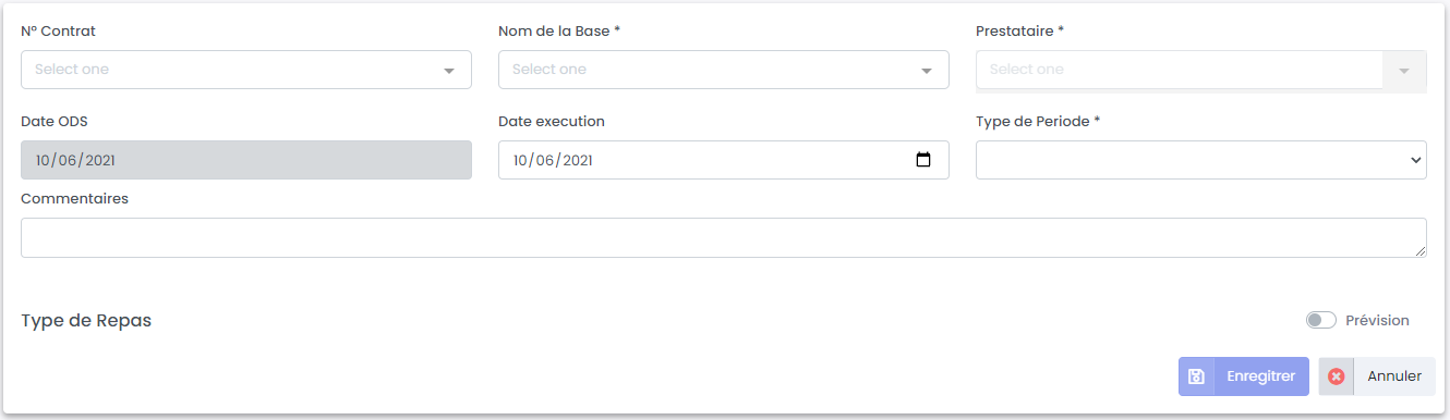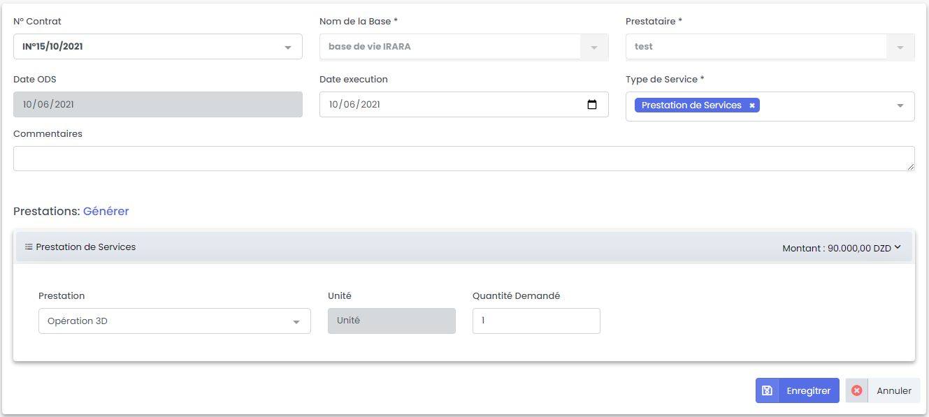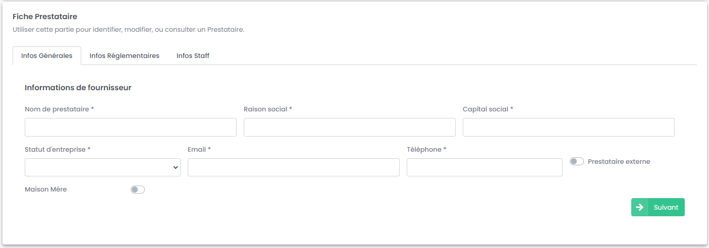 - Prestataire: Sélectionner le prestataire (La liste des prestataires peut être gérée en allant vers: Master Data > Référentiels > Gestion des prestataires) )