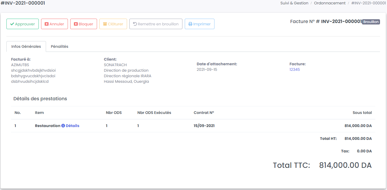 Important: Quand le bouton Valider le contrat est cliqué, Le système va exécuter une vérification des données (conformité des montants, présence des données nécessaires, etc...), si au moin une information n'est pas conforme, un message d'erreur va apparaitre.
