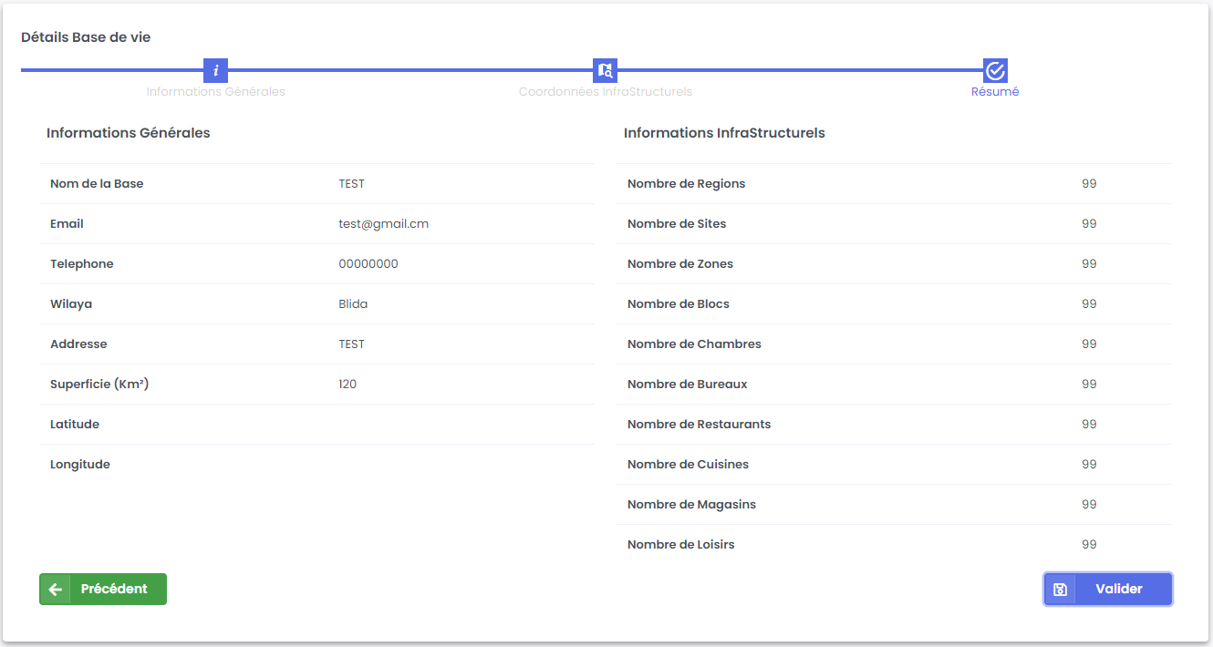 - La liste des sites se trouve en haut du tableau (Pour gérer les sites, allez vers: Master Data > Fiche bases de vies )