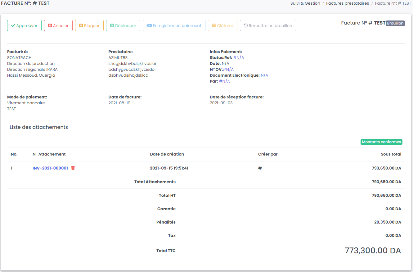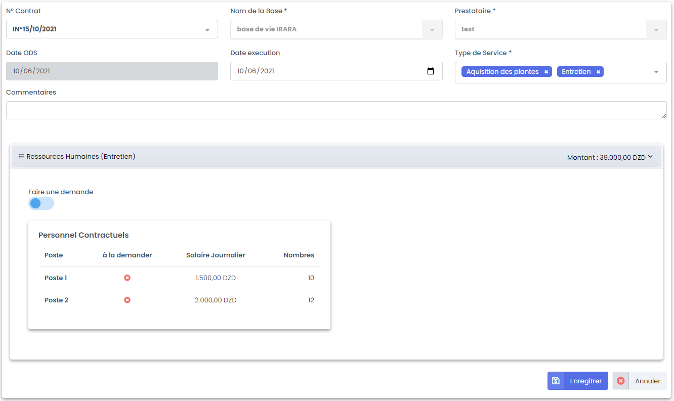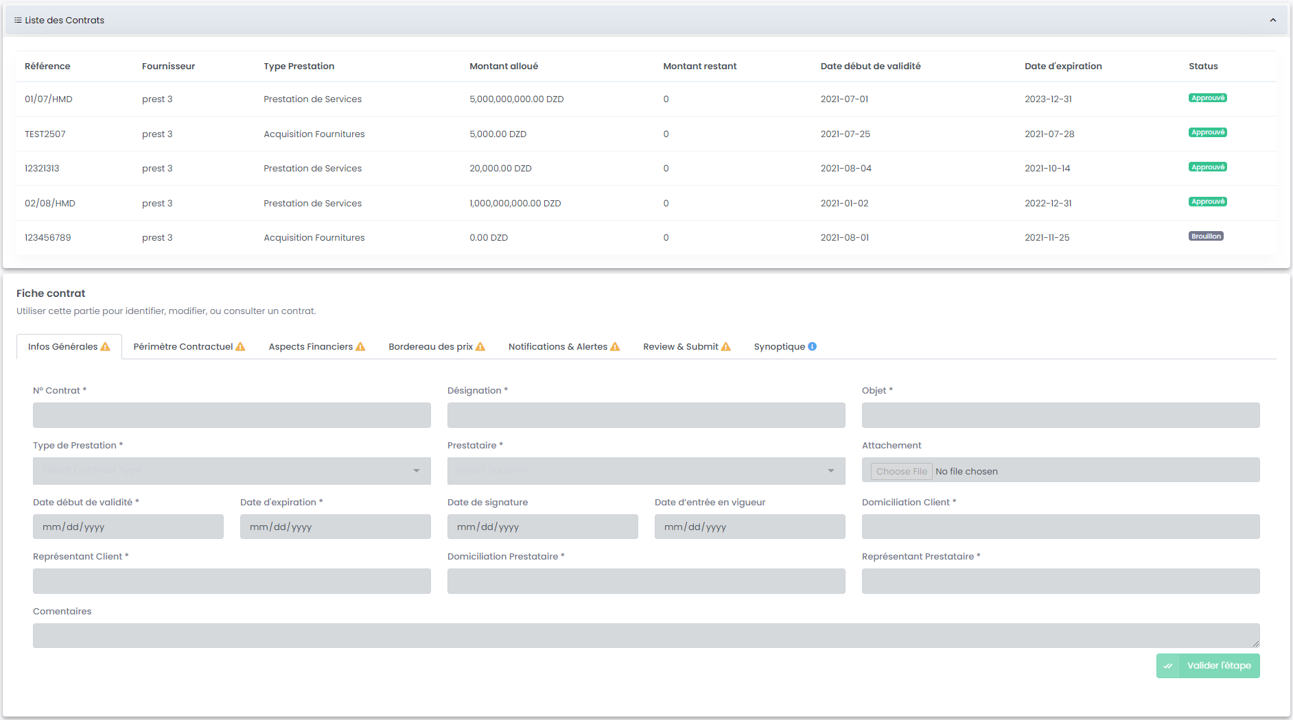 Important: Quand le bouton Valider le contrat est cliqué, Le système va exécuter une vérification des données (conformité des montants, présence des données nécessaires, etc...), si au moin une information n'est pas conforme, un message d'erreur va apparaitre.