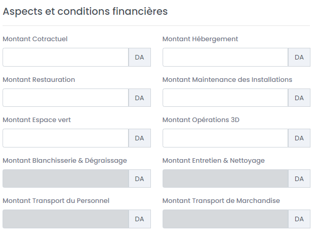 Cette partie est dynamique, les champs sont activés selon ce qu'on a choisit dans la partie: Périmètre Contractuel, pour chaque prestation sélectionnée, son champ du montant est activé