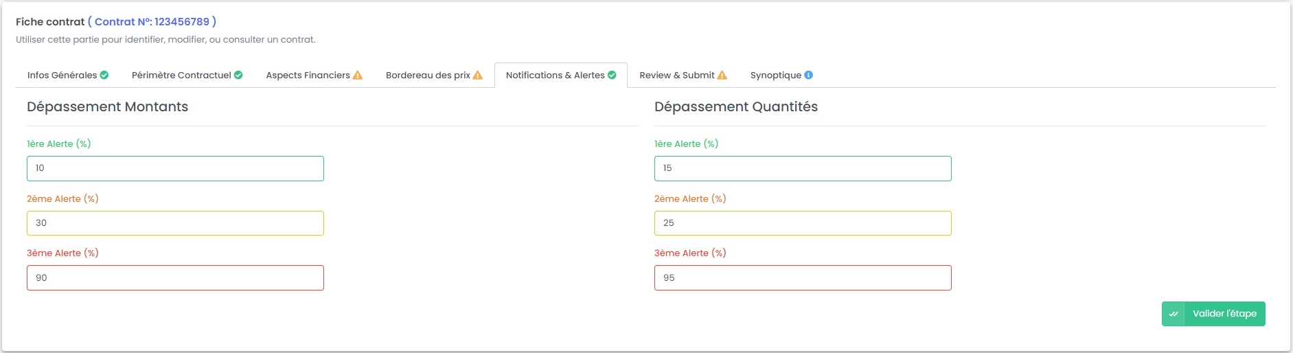 Exemple: Consommation de 85% du montant contractuel, CAMPLUS va lancer des alertes, pour que les responsables de la cellule du contrat peuvent prendre des décisions pour renouveler de contrat ou bien faire un nouveau contrat.