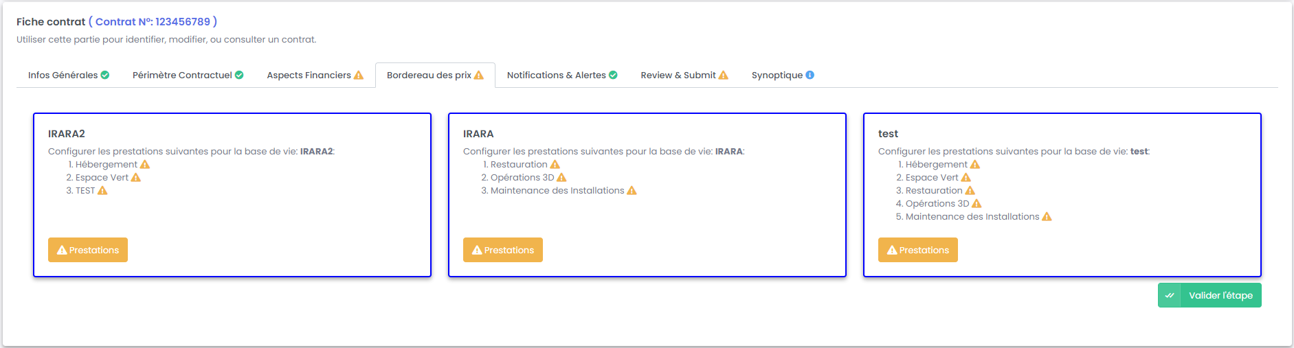 Chaque étape représente le Bordereau des prix d'une prestation pour le site choisit.