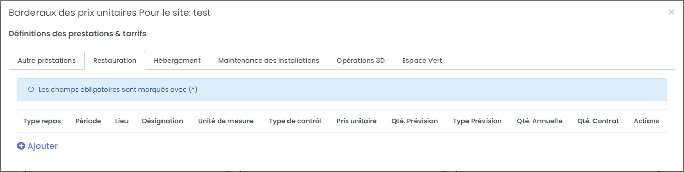 Pour ajouter les différents services de la prestation Restauration, cliquer sur: Ajouter