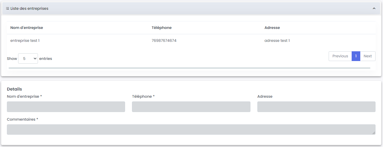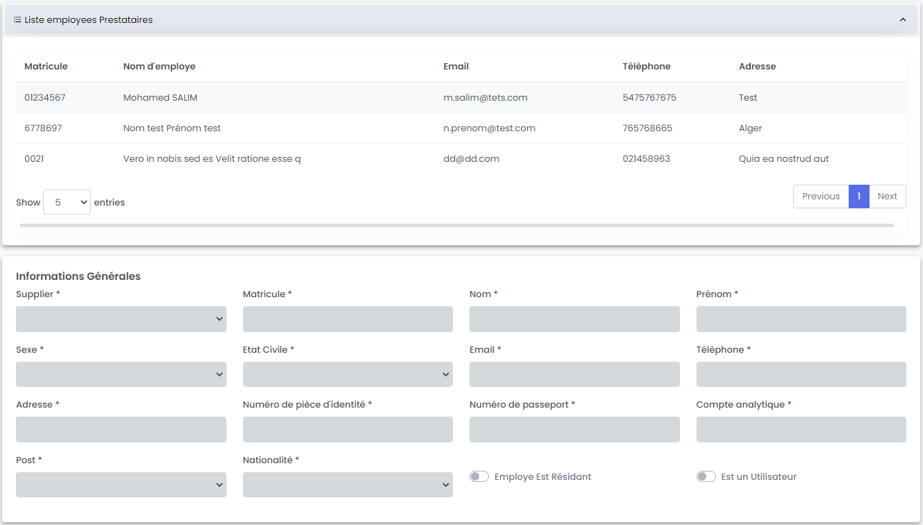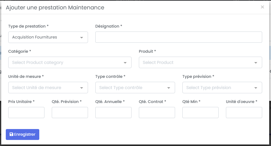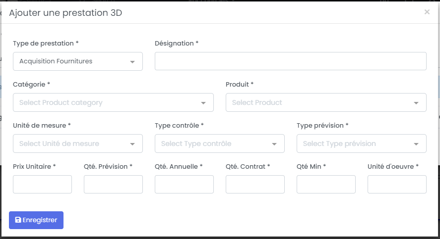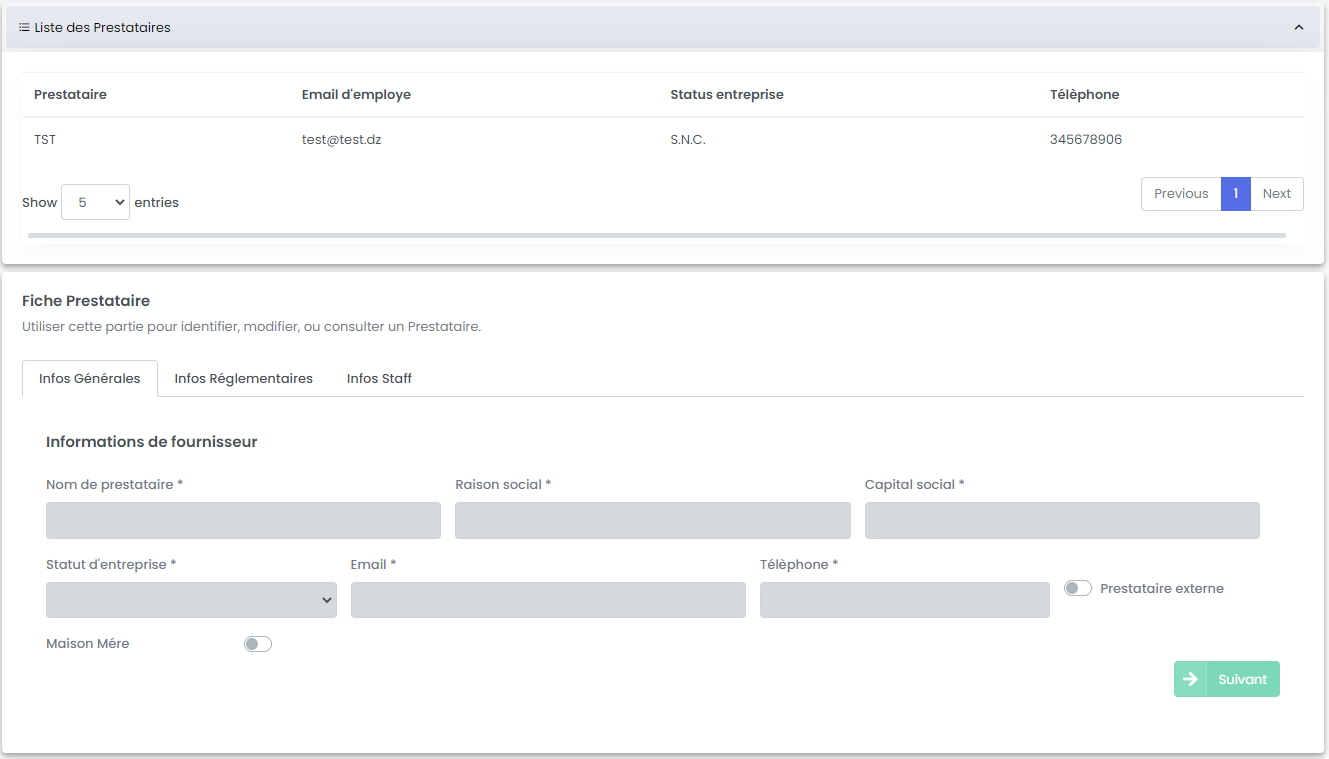 - Prestataire: Sélectionner le prestataire (La liste des prestataires peut être gérée en allant vers: Master Data > Référentiels > Gestion des prestataires) )