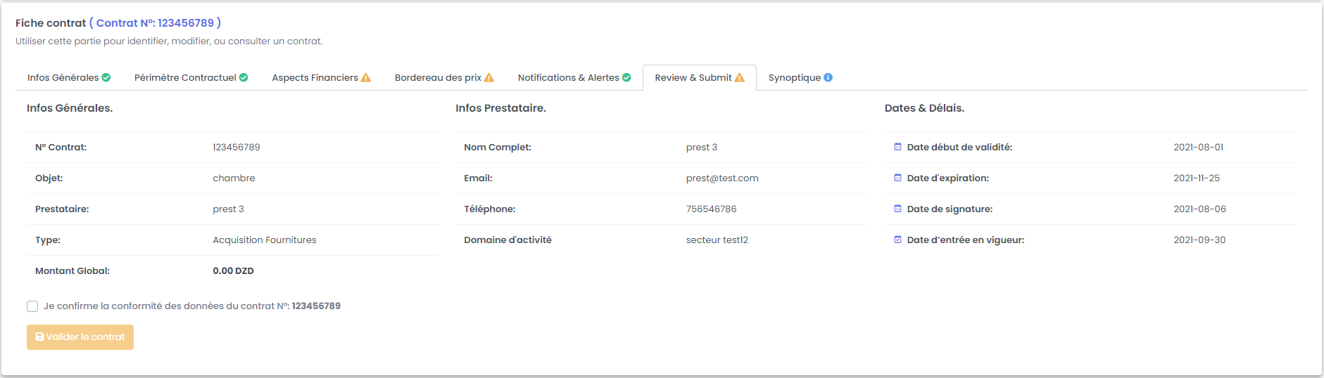 Une fois le contrat est validé, il ne peut être ni modifié, ni supprimé, et il sera exploitable par le système.